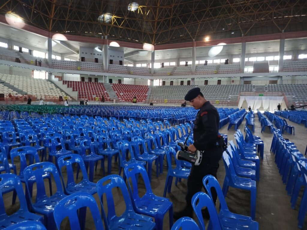 AKBP Octorolas mengatakan personel Jibom dan Kbr melaksanakan sterilisasi meliputi meja, panggung, kursi, toilet, tong sampah, alat musik sound system, genset.