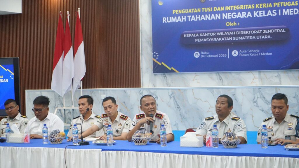 Garudaposnews.id, Medan — Kepala Kantor Wilayah Direktorat Jenderal Pemasyarakatan Sumatera Utara, Yudi Suseno, memberikan penguatan kepada jajaran pengamanan Rutan Kelas I Medan, Rabu (4/2/2026), di Aula Rutan Kelas I Medan. Kegiatan ini diikuti oleh Kepala Bidang Perawatan, Pengamanan dan Kepatuhan Internal, Rindra Wardhana, Karutan Kelas I Medan, Andi Surya, pejabat struktural, serta seluruh jajaran pengamanan Rutan Kelas I Medan.