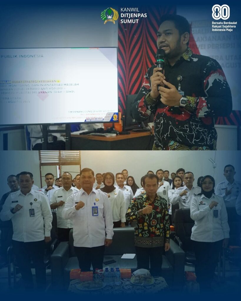 Garudaposnews.id, Medan – Tim Pusat Strategi Kebijakan melaksanakan kegiatan Sosialisasi, Monitoring, dan Inventarisasi pelaksanaan SPAK–SPKP di Aula Kantor Wilayah Direktorat Jenderal Pemasyarakatan Sumatera Utara. Kegiatan ini diikuti oleh para Kepala Unit Pelaksana Teknis (UPT) Imigrasi dan Pemasyarakatan Medan dan sekitarnya, serta satu orang operator perwakilan dari UPT se-Sumatera Utara, baik secara langsung maupun melalui Zoom Meeting, pada Kamis (14/08).