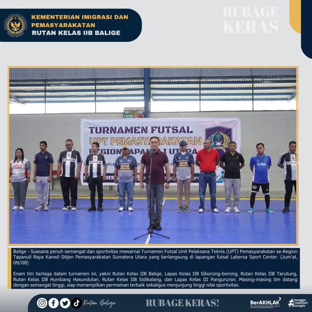 Garudaposnews.id, Balige – Suasana penuh semangat dan sportivitas mewarnai Turnamen Futsal Unit Pelaksana Teknis (UPT) Pemasyarakatan se-Region Tapanuli Raya Kanwil Ditjen Pemasyarakatan Sumatera Utara yang berlangsung di lapangan futsal Labersa Sport Center. (Jum’at, 08/08)